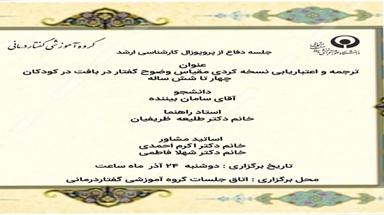 جلسه دفاع ازپروپوزال سامان بیننده دانشجوی مقطع کارشناسی ارشد با عنوان " ترجمه و اعتباریابی نسخه کردی مقیاس وضوح گفتار در بافت در کودکان چهار تا شش ساله" روز دوشنبه 24 آذر ماه 1404 ساعت13 برگزار می شود