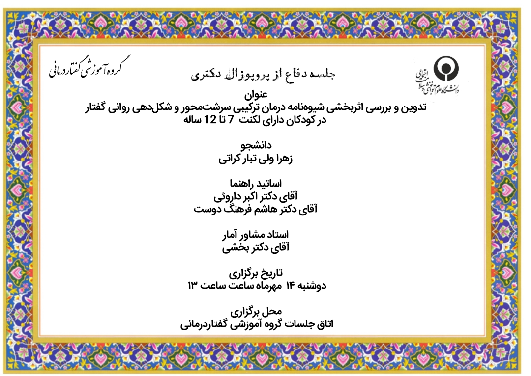 جلسه دفاع پروپوزال دکتری زهرا ولی تبار کراتی رشته گفتاردرمانی روز دو شنبه مورخ 14 مهرماه 1404 ساعت 13 با عنوان " تدوین و بررسی اثربخشی شیوه‌نامه درمان ترکیبی سرشت‌محور و شکل‌دهی روانی گفتار در کودکان دارای لکنت 7 تا 12 ساله" برگزار می شود