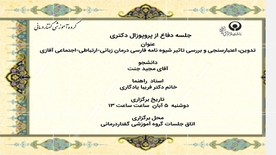 جلسه دفاع پروپوزال دکتری مجید جنت رشته گفتاردرمانی روز دو شنبه مورخ 5 آبان 1404ساعت 13 با عنوان " تدوین، اعتبارسنجی و بررسی تاثیر شیوه نامه فارسی درمان زبانی-ارتباطی-اجتماعی آفازی" برگزار می شود