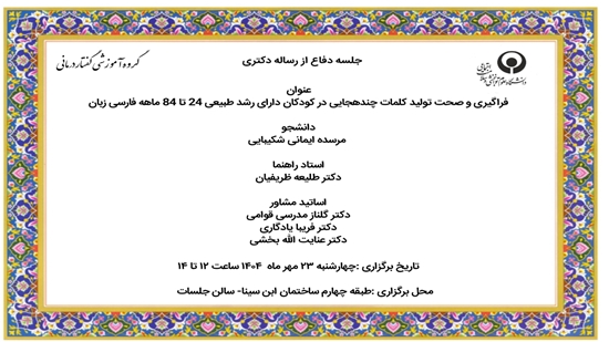 جلسه رساله فاع از رساله دکتری مرسده ایمانی شکیبایی رشته گفتاردرمانی روز چهارشنبه 23 مهر ماه 1404 ساعت 12 تا 14با عنوان " فراگیری و صحت تولید کلمات چندهجایی درکودکان دارای رشد طبیعی 24 تا 84 ماهه فارسی زبان" برگزار می شود